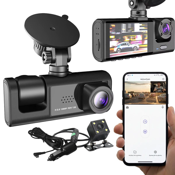 • Grabadora con 3 cámaras (delantera, interior y trasera) soporta imagen FHD/HD y audio.